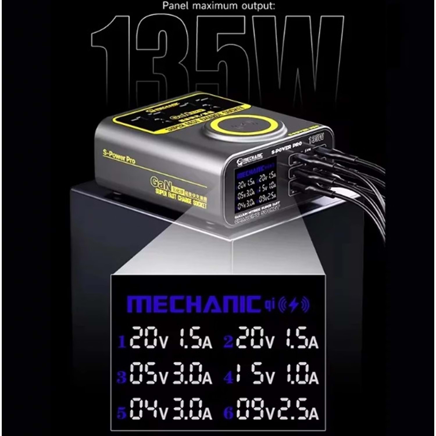 1. Mechanic S-Power Pro süper hızlı şarj soketi, PD67W hızlı şarj teknolojisi, QC3.0 şarj protokolü, 2500W büyük güç çıkışı, 15W kablosuz şarj.